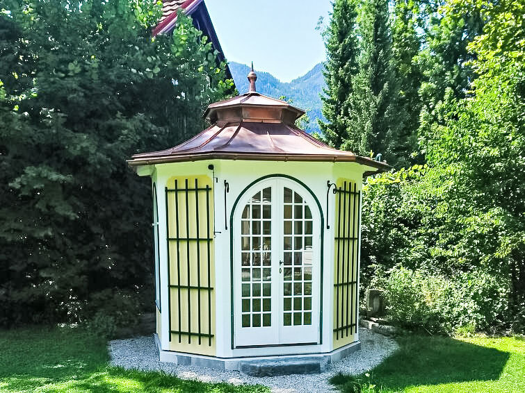 Situé dans le Kurpark, le bâtiment a été complètement rénové et aménagé avec les meubles originaux. Au plein coeur d'un jardin façon Biedermeier, vous trouverez le pavillon, entouré entre autre d'une fontaine. Ici, vous résidez dans un paysage unique tout en profitant des charmes et des loisirs d'une superbe petite ville. Quelques pas seulement séparent le calme et la vie active! villa historique "Rosenvilla", du 19ème siècle, rénovée. Situation centrale, ensoleillée. A usage privé: parc 1'700 m2 avec jardin propice à la détente. Supermarché 200 m, restaurant 100 m, zone piétonne 200 m, arrêt de bus "541,546" 130 m, gare ferroviaire "Bad Ischl" 1 km, centre thermal "Eurothermenressort Bad Ischl" 800 m. Terrain de golf (18 trous) 6 km, tennis 3 km, téléphérique 5 km, téléski 21 km. Attractions à proximité: Stadtmuseum Bad Ischl 30 m, Kongress- und Theaterhaus Ischl 50 m, Franz Lehar Filmtheater 500 m, Kaiservilla 900 m, UNESCO Welterbeort Hallstatt 21 km. Les domaines skiables de renommée sont facilement accessibles: Feuerkogel Ebensee 20 km. Les lacs connus sont facilement accessibles: Wolfgangsee 13 km, Attersee und Traunsee 19 km. Région de randonnées: Nussensee, Katrinalm, Postalm. Veuillez noter: non adapté aux enfants de moins de 10 ans. La remise des clés a lieu à l’agence SKGT Touristik de Götzstr. 12, 1 km. Environnement très sensible au bruit. Silence et bonne tenue exigés.